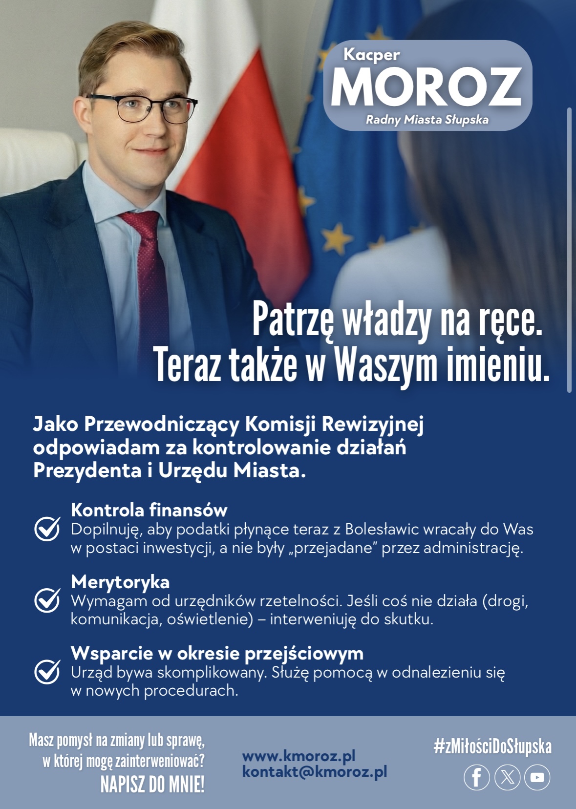 – Moja odpowiedź jest prosta: będę tego pilnował osobiście. Jako radny opozycyjny patrzę władzy na ręce – teraz także w imieniu nowych Mieszkańców Słupska – deklaruje Kacper Moroz.